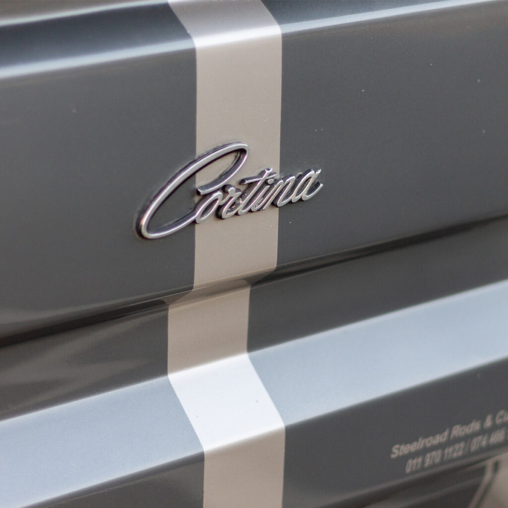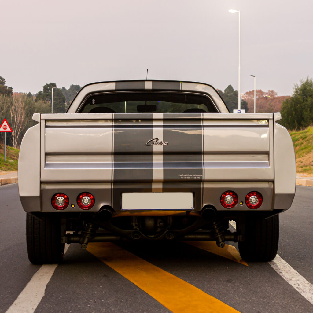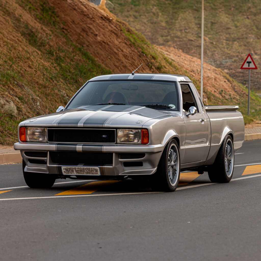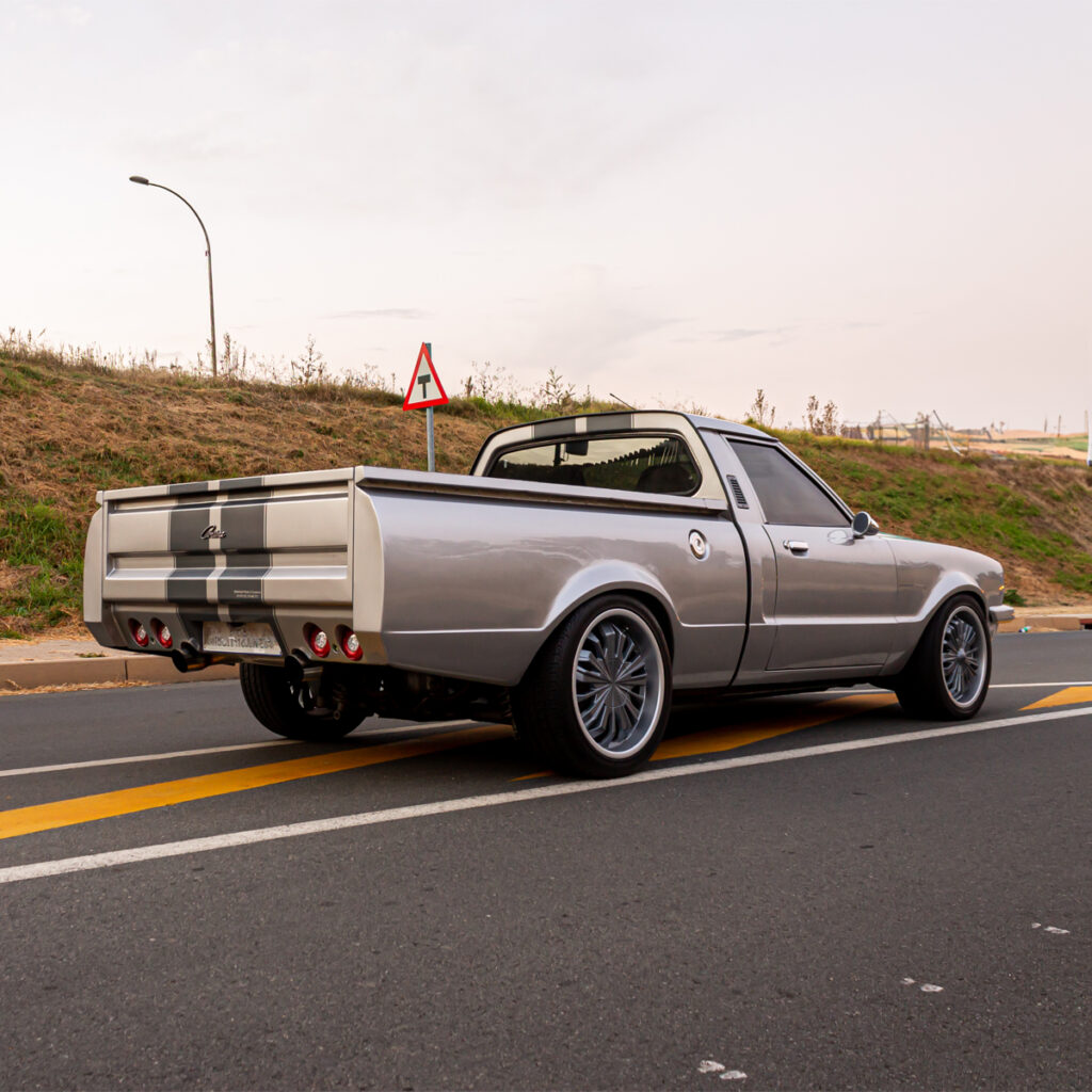 A Labor of Love: The transformation wasn’t just under the hood. Willie and his team at Steelroad Rods & Customs poured their souls into every inch of the Cortina’s bodywork. Fender flares, front spoilers, and bonnet scoops were meticulously fabricated, while a custom Sikkens-based silver paint job with a hint of red pearl brought the bakkie to life.